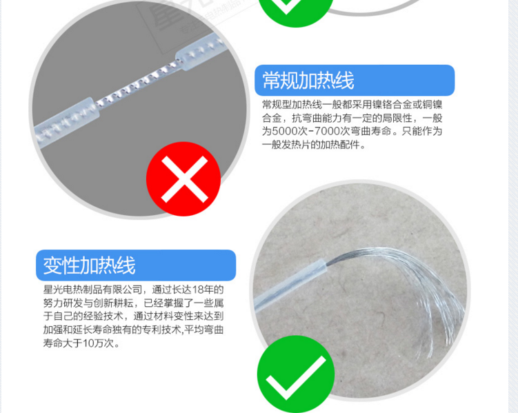 老式發(fā)熱片多采用網狀碳纖維或螺旋式發(fā)熱線為加熱導體,碳纖維加熱片易出現(xiàn)局部燒穿,起火的現(xiàn)象,主要為網狀碳纖維和邊緣銅帶無法進行有效的導電性能造成的,螺旋式發(fā)熱線易出現(xiàn)斷絲的情況,其主要表現(xiàn)用戶的使用習慣和環(huán)境為運動型,發(fā)熱絲畢竟是金屬物體,在重力和運動的模式下,導致發(fā)熱絲斷裂只是時間問題.