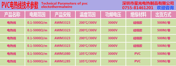 PVC電熱線,簡稱發(fā)熱線,也有PVC加熱絲之稱呼,內(nèi)部多采用鎳鉻合金,康銅合金,銅鎳合金為加熱導(dǎo)體,采用PVC為絕緣層,以<Ω/M>為電阻單位,粗細單位<MM>顏色任意可選,產(chǎn)品耐溫極限為105℃, 長期80℃以下使用壽命長達8-12年, 產(chǎn)品抗拉和彎曲性能很好,通??梢猿惺?5KG以下的拉力,產(chǎn)品彎曲參考UL758相關(guān)標準,以25000次為技術(shù)標準,產(chǎn)品成本低廉,被行業(yè)認定為適用的加熱組件之一