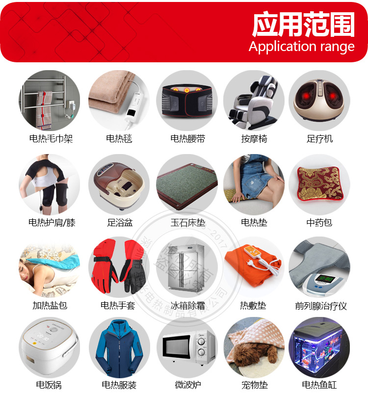 家用電器,醫(yī)療用途,電飯煲,電熱毛巾箱,微波爐,電熱腰帶,按摩器,按摩椅,熱敷墊,足療機(jī),玉石床墊,醫(yī)療器械,養(yǎng)殖取暖,電熱毛巾架,冰箱除霜,冷庫(kù)防凍,馬桶蓋,電暖器,電地暖,毛巾恒溫箱等,電熱文胸,電熱眼罩,電熱鞋墊,移動(dòng)桑拿房,前列腺治療儀,中藥包,熱敷鹽包, 足浴盆,