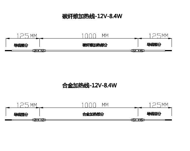 如上圖所示同樣的長(zhǎng)度和功率,就會(huì)產(chǎn)生不同的工作溫度,碳纖維的發(fā)熱效率,會(huì)明顯高于合金加熱線,這和電熱線自身的結(jié)構(gòu)是分不開(kāi)的,硅膠電熱線是螺旋結(jié)構(gòu),而且是金屬導(dǎo)體,自身體積比較長(zhǎng),所以發(fā)熱就慢,碳纖維是直絲,屬于半導(dǎo)體,所以發(fā)熱就快很多,